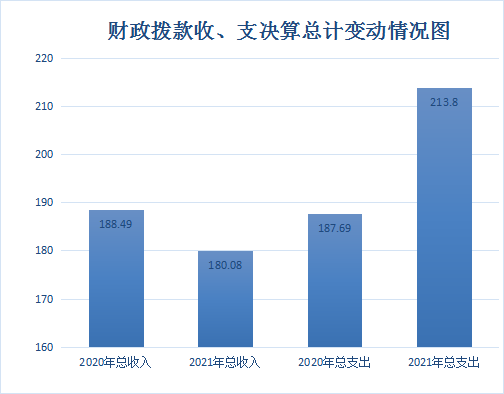青川县沙州镇营盘小学2021年财政拨款收入总计180.08万元、支出总计213.80万元。与2020年相比,财政拨款收入减少8.41万元,下降4.46%;财政拨款支出增加26.11万元,增加13.91%,以上主要变动原因:是因为办公费用增加。
