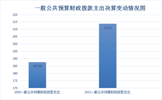 青川县沙州镇营盘小学2021年度一般公共预算财政拨款支出213.80万元,占本年支出合计的100%。与2020年相比,一般公共预算财政拨款支出增加26.11万元,增加13.91%,主要变动原因为公费增加。