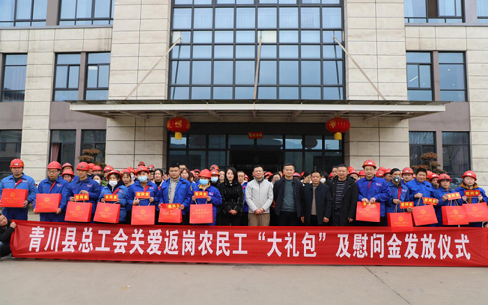 2月2日,青川县总工会慰问组一行带着新春慰问品走进四川中哲新材料科技有限公司开展返岗农民工慰问活动,为400余名返岗农民工发放价值8万余元的“大礼包”及返岗慰问金,同时向他们送去了新春的祝福和工会组织的温暖。