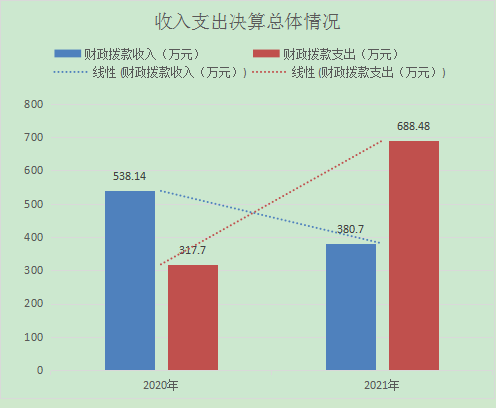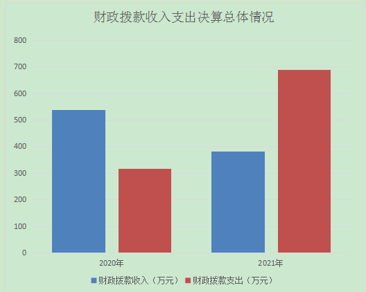 2021年度收入总计380.7万元、支出总计688.48万元。与2020年相比,收入总计减少157.44万元,下降29.26%,主要变动原因是2020年非贫困村公益性岗位补贴130万元纳入当年收入。支出总计增加370.78万元,增长116.7%。主要变动原因是2021年新增节能环保支出257万元、2021年创业担保贷款贴息相比2020年支出增加168.22万元、2021年就业补助相比2020年支出减少111.68万元。