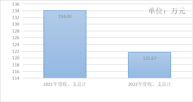 2022年度收、支总计121.67万元。与2021年相比,收入减少12.36万元,下降9%,支出减少7.45万元,下降6%。主要变动原因是人员减少1人。