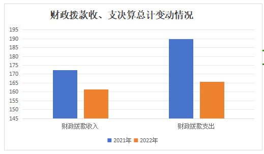 2022年财政拨款收入总计161.44万元。与2021年相比,财政拨款收入总计减少10.96万元,下降6.36%。主要变动原因是在职人员减少,收入减少;2022年财政拨款支出总计165.83万元。与2021年相比,财政拨款支出总计减少16.46 万元,下降9.03%。主要变动原因是在职人员减少,费用减少。