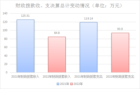 2022年财政拨款收入总计84.80万元、支出总计93.90万元。与2021年相比,财政拨款收入减少40.51万元、支出总计减少25.24万元,各下降32.33%、21.19%。主要变动原因是本乡常住人口减少,项目拨款减少;支出增加院内附属设施配套升级,公用经费增加,本年基药县级配套资金暂未拨付至村医,公卫资金使用较上年减少,项目支出减少等。