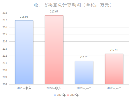 2022年度收入总计217.67万元、支出总计212.28万元。与2021年相比,收入总计增加0.72万元、支出总计增加1万元,分别增长0.33%、0.47%。收入主要变动原因是本年度医疗服务能力提升,业务收入增加,故本年度收入增加;本年支付部分为上年结转资金,故支出增加。