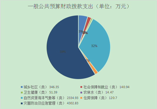 2022年一般公共预算财政拨款支出7316.24万元,主要用于以下方面:一般公共服务(类)支出4.63万元,占0.06%;社会保障和就业(类)支出140.94万元,占1.93%;卫生健康(类)支出51.39万元,占0.70%;农林水(类)支出14.47万元,占0.20%;自然资源海洋气象等(类)支出2334.93万元,占31.91%;住房保障(类)支出120.7万元,占1.65%;灾害防治及应急管理(类)支出4302.83万元,占58.81%;城乡社区(类)支出346.35万元,占4.74%。