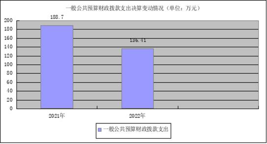 2022年一般公共预算财政拨款支出136.41万元,占本年支出合计的 49.82%。与2021年相比,一般公共预算财政拨款支出减少52.29万元、减少27.71%,减少主要原因财政拨款收入减少,支出相应减少。