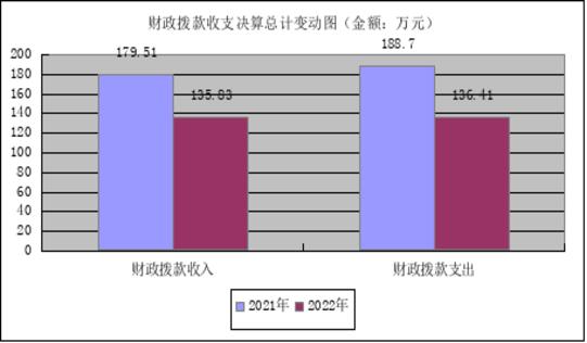 2022年财政拨款收入总计135.83万元、支出总计136.41元。与2021年相比,财政拨款收入减少43.68万元、支出总计减少52.29万元,各减少24.33%、27.71%。主要变动原因是财政基本拨款和项目拨款减少。同时财政基本拨款和项目支出经费减少。