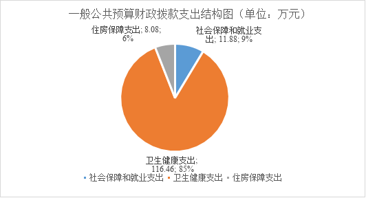 2022年一般公共预算财政拨款支出136.41万元,主要用于以下方面:社会保障和就业支出11.88万元,占8.65%;卫生健康支出116.46万元,占85.37%;住房保障支出8.08万元,占5.98%。