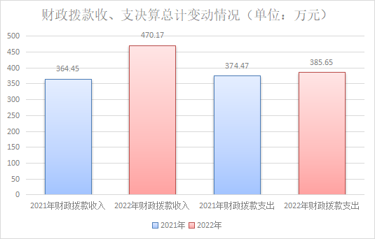 2022年财政拨款收入总计470.17万元、支出总计385.65万元。与2021年相比,财政拨款收入增加105.72万元、支出总计增加11.18万元,各增长29.01%、2.99%。主要变动原因是本年度医院服务能力提升,相应配套设施支出增加,新增县域医疗次中心建设项目及2022年工资调标等。