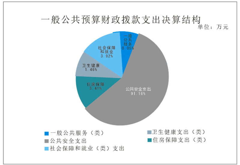 2022年一般公共预算财政拨款支出6372.92万元,主要用于以下方面:一般公共服务支出3万元,占0.05%;公共安全支出5809.49万元,占91.16%;社会保障和就业支出249.82万元,占3.92%;卫生健康支出93.05万元,占1.46%;住房保障支出217.57万元,占3.41%。