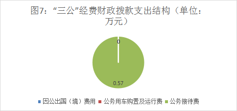 2022年“三公”经费财政拨款支出决算中,因公出国(境)费支出决算0万元,占0%;公务用车购置及运行维护费支出决算0万元,占0%;公务接待费支出决算0.57万元,占100%。具体情况如下: