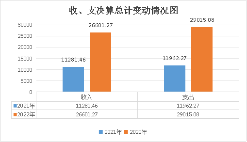 2022年度收入总计26601.27万元,支出总计29015.08万元。与2021年相比,收、支总计各增加15319.81万元、17052.81万元,分别增长135.80%、142.55%。主要变动原因是2022年新增4A级青溪古城提升项目和战国木牍文化生态园4A级景区提升项目政府性基金预算财政拨款收入。