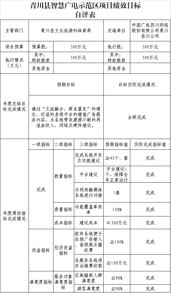 青川县智慧广电示范区项目,实施过程中,严格遵守国家法律法规,严格落实项目过程监管,资金使用严格按照财政专项资金管理制度执行,社会效益良好,经济效益正在逐步实现,项目运营管理健康有序,项目评价结论为符合绩效目标。