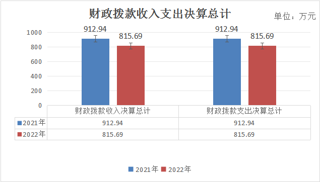 2022年度收、支总计815.69万元。与2021年相比,收、支各总计减少97.25万元,下降10.65%。主要变动原因是按照有关要求,树立过“紧日子”和坚持厉行节约、反对浪费意识,强化内部管理,进一步压减费用支出。