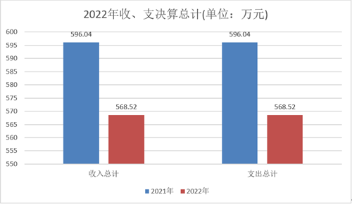 2022年度收入总计568.52万元、支出总计568.52万元。与2021年相比,收入总计减少27.52万元,下降4.84%; 支出总计减少27.52万元,下降4.84%。主要变动原因是项目经费支出减少。