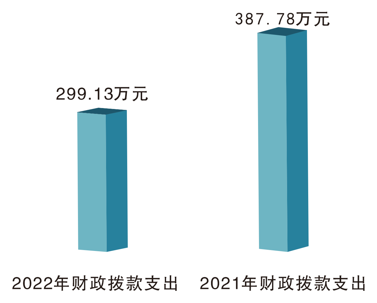 2022年一般公共预算财政拨款支出299.13万元,占本年支出合计的100%。与2021年相比,一般公共预算财政拨款支出减少88.65万元,下降22.86%。主要变动原因是本年度公务接待费按照要求追减29万元,年末财政应支清退33.71万元,还存在着12月份未完善手续支付的款项。