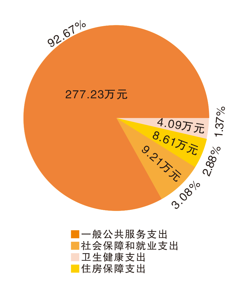 2022年一般公共预算财政拨款支出299.13万元,主要用于以下方面:一般公共服务支出277.23万元,占92.67%;教育支出0万元,占0%;科学技术支出0万元,占0%;文化旅游体育与传媒支出0万元,占0%;社会保障和就业支出9.21万元,占3.08%;卫生健康支出4.09万元,占1.37%;住房保障支出8.61万元,占2.88%。