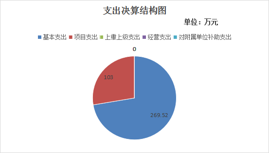 2022年本年支出合计372.52万元,其中:基本支出269.52万元,占72.35%;项目支出103万元,占27.65%;上缴上级支出0万元,占0%;经营支出0万元,占0%;对附属单位补助支出0万元,占0%。