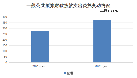 2022年一般公共预算财政拨款支出372.52万元,占本年支出合计的100%。与2021年相比,一般公共预算财政拨款支出增加95.64万元,增长34.54%。主要变动原因是2022年新进1名公务员,人员经费、公用经费增加;2022年项目经费增加。