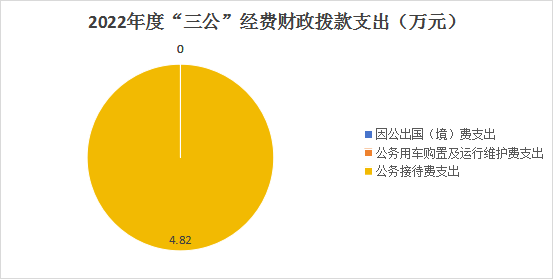 2022年“三公”经费财政拨款支出决算中,因公出国(境)费支出决算0万元,占0%;公务用车购置及运行维护费支出决算0万元,占0%;公务接待费支出决算4.82万元,占100%。具体情况如下: