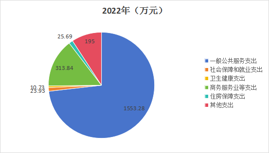 2022年一般公共预算财政拨款支出2122.47万元,主要用于以下方面:一般公共服务(类)支出1553.28万元,占73.18%;教育支出(类)0万元,占0%;科学技术(类)支出0万元,占0%;文化旅游体育与传媒(类)支出0万元,占0%;社会保障和就业(类)支出23.93万元,占1.13%;卫生健康(类)支出10.73万元,占0.5%;商业服务业等(类)支出313.84,占14.79%;住房保障(类)支出25.69万元,占1.21%;其他(类)支出195.00万元,占9.19%。