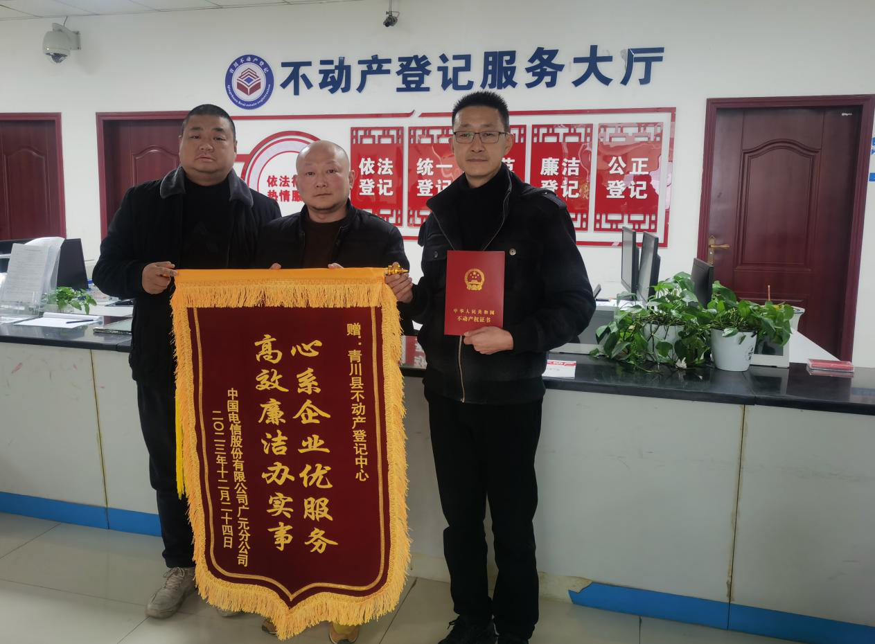 近日,中国电信股份有限公司广元分公司为青川县不动产登记中心送来印有“心系企业 优服务 高效廉洁 办实事”的锦旗。