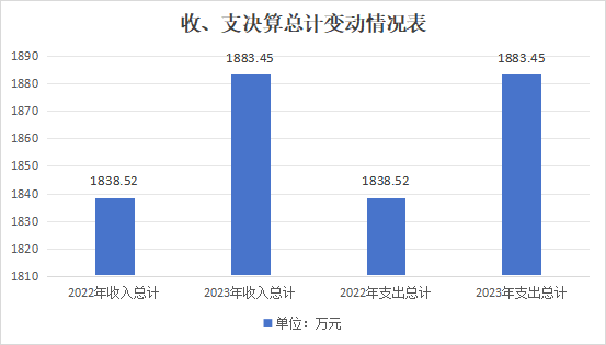 2023年度收、支总计均为1883.45万元。与2022年度相比,收、支总计各增加44.93万元,增长2.44%。主要变动原因是基本支出增加23.4万元、项目支出增加23万元。