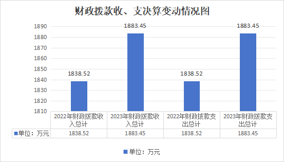 2023年度财政拨款收、支总计均为1883.45万元。与2022年度相比,财政拨款收、支总计各增加44.93万元,增长2.44%。主要变动原因是基本支出增加23.4万元、项目支出增加23万元。