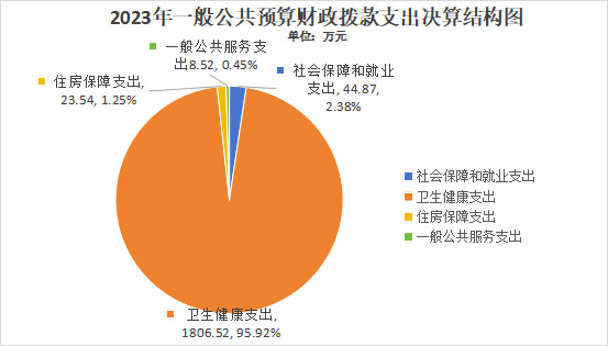 2023年度一般公共预算财政拨款支出1883.45万元,主要用于以下方面:一般公共服务支出8.52万元,占0.45%;社会保障和就业支出44.87万元,占2.38%;卫生健康支出1806.52万元,占95.92%;住房保障支出23.54万元,占1.25%。
