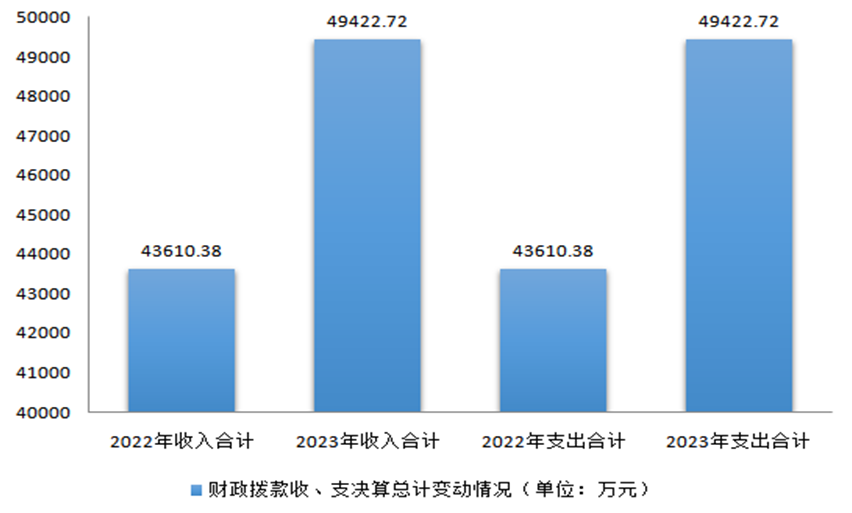2023年度收、支总计均为52925.70万元。与2022年度相比,收、支总计各增加7142.15万元,增长15.60%。主要变动原因为:一是本级财政对教育投入的增加,如青川县乔庄初级中学校迁建项目、保安服务费等项目;二是专项资金投入增加,如教育强国项目教去年增加、义教公用经费提标等;三是按照2022年9月1日起施行的《中小学校财务制度》(财教〔2022〕159号)文件规定,课后延时服务费计入其他收入。