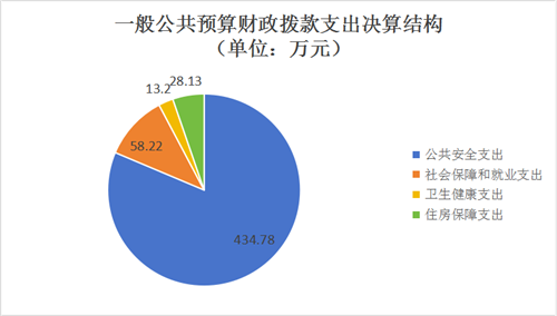 2023年度一般公共预算财政拨款支出534.33万元,主要用于以下方面:公共安全支出434.78万元,占81.4%;社会保障和就业支出58.22万元,占10.8%;卫生健康支出13.2万元,占2.5%;住房保障支出28.13万元,占5.3%。