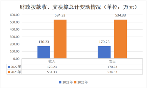 2023年度财政拨款收、支总计均为534.33万元。与2022年度相比,财政拨款收、支总计各增加364.1万元,增长213.9%。主要变动原因是人员增加15人,人员经费和公用经费增加。