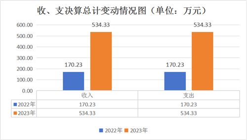 2023年度收、支总计均为534.33万元。与2022年度相比,收、支总计各增加364.1万元,增长213.9%。主要变动原因是人员增加15人,人员经费和公用经费增加。