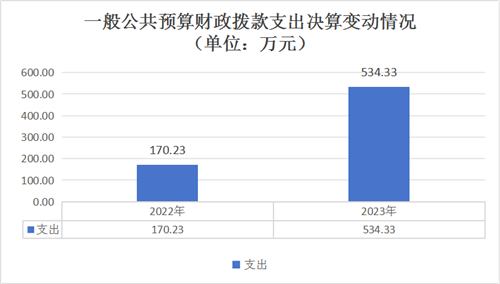2023年度一般公共预算财政拨款支出534.33万元,占本年支出合计的100%。与2022年度相比,一般公共预算财政拨款支出增加364.1万元,增长213.9%。主要变动原因是人员增加15人,人员经费和公用经费增加。