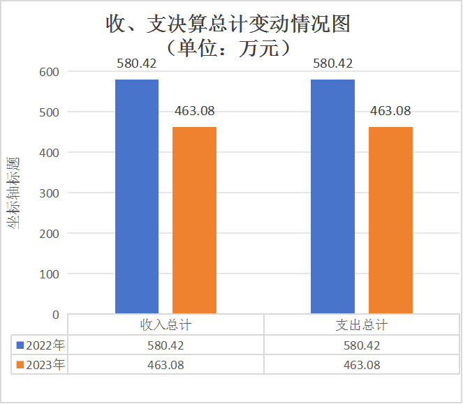 2023年度财政拨款收、支总计均为463.08万元。与2022年度相比,财政拨款收入总计减少117.34万元,支出总计减少117.34万元,收入下降20.2%,支出减少20.2%。主要变动原因:本年度项目资金收入支出减少。