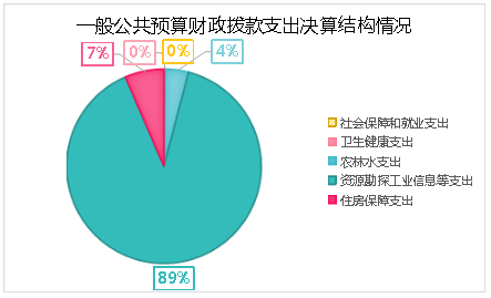 2023年度一般公共预算财政拨款支出15976.23万元,主要用于以下方面:社会保障和就业支出23.01万元,占比0.14%;卫生健康支出4.76万元,占0.03%;农林水支出623.90万元,占3.91%;资源勘探工业信息等支出14290.99万元,占89.45%;住房保障支出1033.57万元,占6.47%。