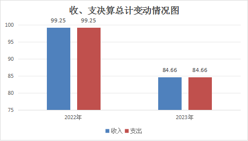 2023年度收入84.66万元、支出84.66万元。与2022年收入99.25万元、支出99.25万元相比,收增加减少14.59万元、支出减少14.59万元。主要变动原因是项目资金减少。