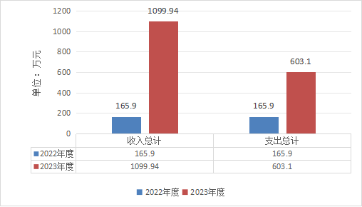 2023年度收、支总计均为1099.94万元。与2022年度相比,收、支总计均增加934.04万元,增长563.01%。主要变动原因是项目资金大量增加。