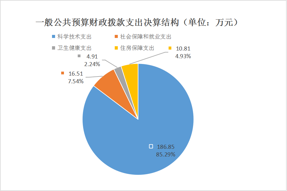 2023年度一般公共预算财政拨款支出219.09万元,主要用于以下方面:科学技术支出186.85万元,占85.29%;社会保障和就业支出16.51万元,占7.54%;卫生健康支出4.91万元,占2.24%;住房保障支出10.81万元,占4.93%。