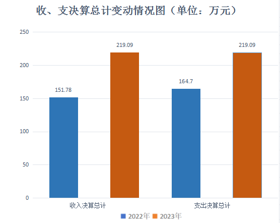2023年度收、支总计均为219.09万元。与2022年度相比,收入总计增加67.31万元,增长44.34%;支出总计增加54.39万元,增长33.02%。主要变动原因是工资福利支出及项目支出增加。