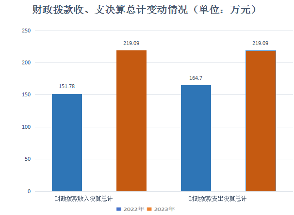 2023年度财政拨款收、支总计均为219.09万元。与2022年度相比,财政拨款收入增加67.31万元,增长44.34%;财政拨款支出增加54.39万元,增长33.02%。主要变动原因是工资福利支出及项目支出增加。
