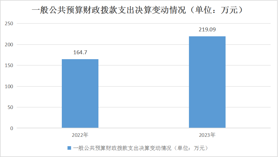 2023年度一般公共预算财政拨款支出219.09万元,占本年支出合计的100%。与2022年度相比,一般公共预算财政拨款支出增加54.39万元,增长33.02%。主要变动原因是工资福利支出及项目支出增加。