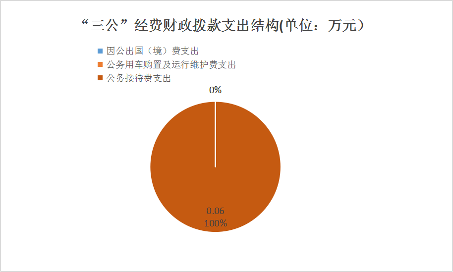 2023年度“三公”经费财政拨款支出决算中,因公出国(境)费支出决算0万元,占0%;公务用车购置及运行维护费支出决算0万元,占0%;公务接待费支出决算0.06万元,占100%。具体情况如下: