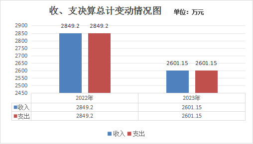 2023年度收、支总计均为2601.15万元。与2022年度相比,收、支总计各下降248.05万元,下降8.7%。主要原因是新进人员增加,专项资金减少。