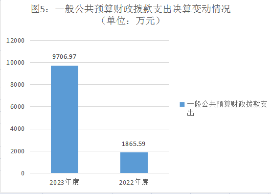 2023年度一般公共预算财政拨款支出9706.97万元,占本年支出合计的100%。与2022年度相比,一般公共预算财政拨款支出增加7841.38万元,增长420.31%。主要变动原因是建设项目收、支增加。