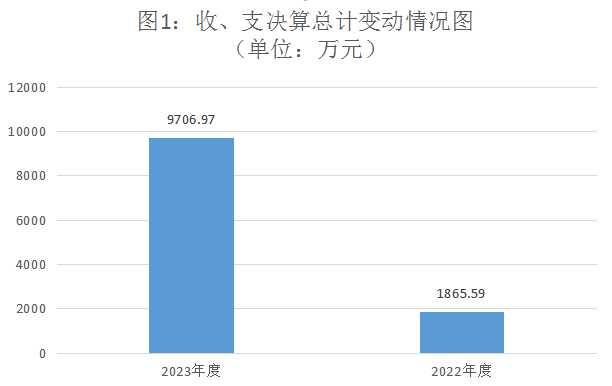2023年度收、支总计均为9706.97万元。与2022年度相比,收、支总计各增加7841.38万元,增长420.31%。主要变动原因是建设项目收、支增加。