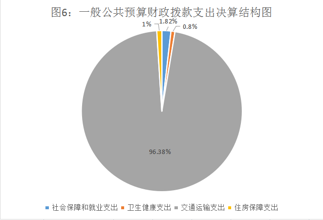 2023年度一般公共预算财政拨款支出9706.97万元,主要用于以下方面:社会保障和就业支出176.39万元,占1.82%;卫生健康支出77.56万元,占0.8%;交通运输支出9355.33万元,占96.38%;住房保障支出97.68万元,占1%。