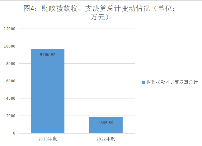2023年度财政拨款收、支总计均为9706.97万元。与2022年度相比,财政拨款收、支总计各增加7841.38万元,增长420.31%。主要变动原因是建设项目收、支增加。