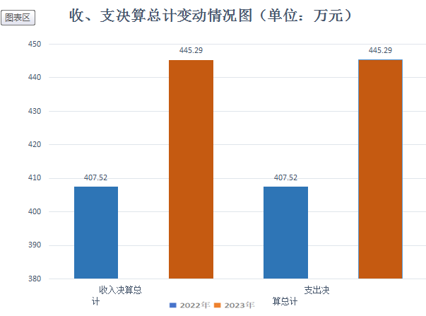 2023年度收、支总计均为456.69万元。与2022年度相比,收、支总计各增加49.17万元,上升10.77%。主要变动原因是人员增加,工资福利支出增加。