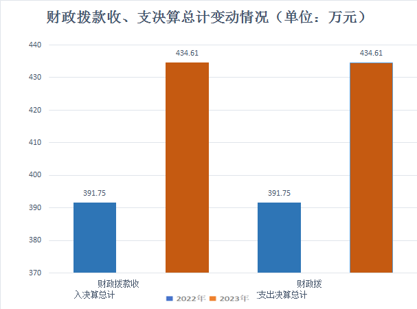 2023年度财政拨款收、支总计均为434.61万元。与2022年度相比,财政拨款收、支总计各增加42.86万元,增长10.94%。主要变动原因是人员增加,工资福利支出增加。